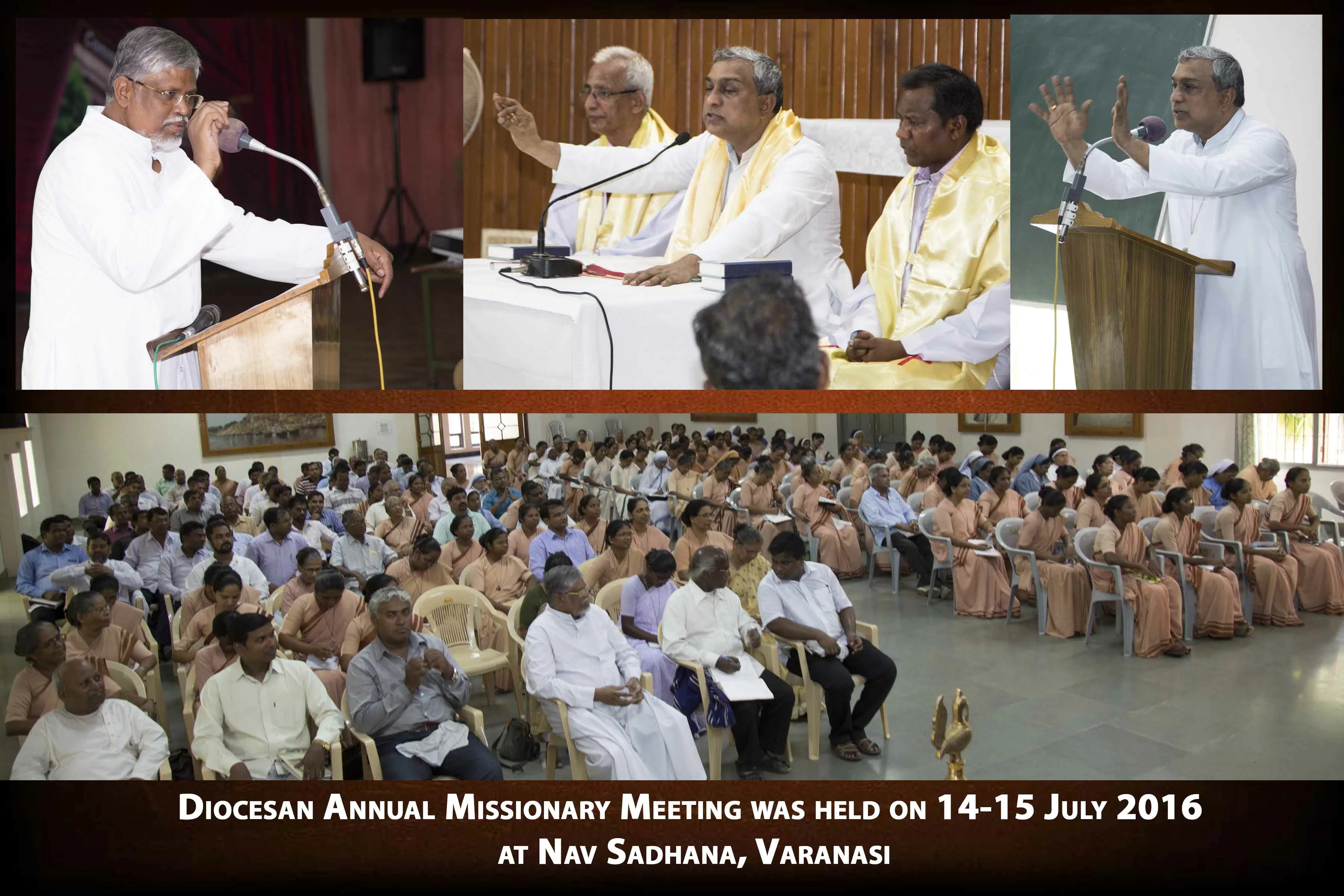 Diocesan Annual Missionary Meeting was held on 14-15 July 2016 at Nav Sadhana, Varanasi. Around 225 missionaries of our diocese participated and benefited from the meeting. The meeting began on 14th of July at 9.30 am with Bible Procession. The Holy Bible was brought to the dais in procession by Fr. Sushil Prakash. It was received, garlanded and revered by Rt. Rev. Eugene Joseph, Bishop of Varanasi. Fr. Arockia Dass read the word of God and Fr. Vijay Shanti Raj said a reflective prayer. Rt. Rev. Eugene Joseph Bishop of Varanasi introduced Fr. Panneer Selvam the resource person and the topic of the meeting - Post-Synod Exhortation, Amoris Laetitia - "The Joy of Love" In the first session, Fr. Panneer Selvam educated the participants about Amoris Laetitia by presenting the content of the Exhortation. He made everyone to realize that every single sentence from 325 paragraphs of the Exhortation is very important. In the second session, the pastoral nature of the Exhortation was presented to reflect upon the family mission works of the diocese. This encouraged everyone to be a sign of Mercy wherever family life remains imperfect or lacks peace and joy. Before the lunch break all gathered in the chapel for the Eucharistic Celebration. In the short homily, Bishop Eugene Joseph explained the importance of yoke of Christ in the lives of the disciples. He emphasized that we accomplish our mission not merely by our heroism and capacity but with the help of Christ our Savior. In the third session Bishop Eugene Joseph instructed fathers and sisters about the cleanliness of the church. He emphasized to have Indian culture in all our worships and rituals. The fathers and sisters from different mission stations shared about their mission activities. Mainly they put forward the functionality of SCC in the mission stations. Evening at 6.15 pm a stage drama called Mann Maya was presented to the participants and the neighboring communities. The Drama depicted the infinite mercy of God. It was a joint venture of Diocesan Social Communication Centre and Vishwa Jyoti Communication Centre, Produced by Diocese of Varanasi. The Drama and the artists were introduced by Fr. Anand Mathew IMS the director of Vishwa Jyoti Communication Centre. On behalf Bishop Fr. S. Joseph, the Director of Diocesan Social Communication, thanked the team and the audience. In the second day Fr. Panneer Selvam led the participants in to spiritual applications of the Exhortation. He helped to enter into a spiritual realm of mercy of God. Every session started with praise and worship lead by Fr. Arockia Dass and Sr. Sulekha SRA. The meeting came to an end with Holy hour and benediction. On behalf of Bishop Fr. Y. Joseph thanked the resource person and all those helped to make the meeting successful.